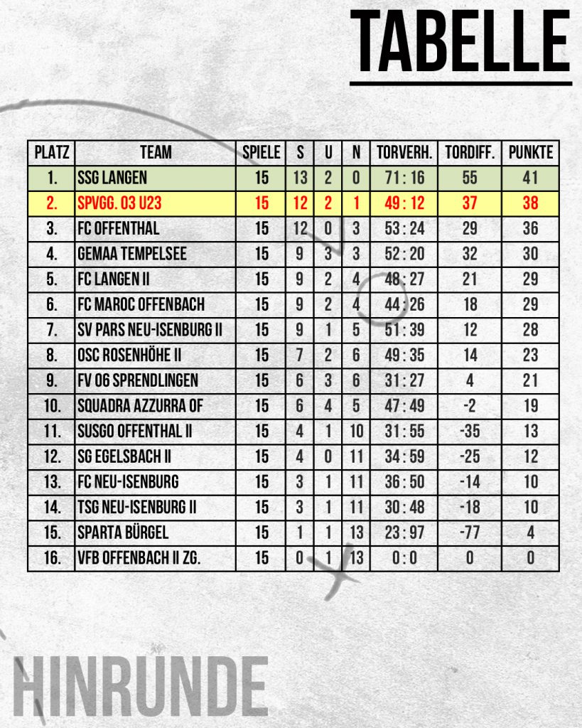 Im letzten Spiel einer starken Hinrunde konnte sich unsere U23 am letzten Sonntag ungefährdet mit 6:0 bei der SG Egelsbach II durchsetzen. Mit 38 Punkten aus 15 Spielen haben wir bereits jetzt die Punkteausbeute der gesamten Vorsaison eingestellt.